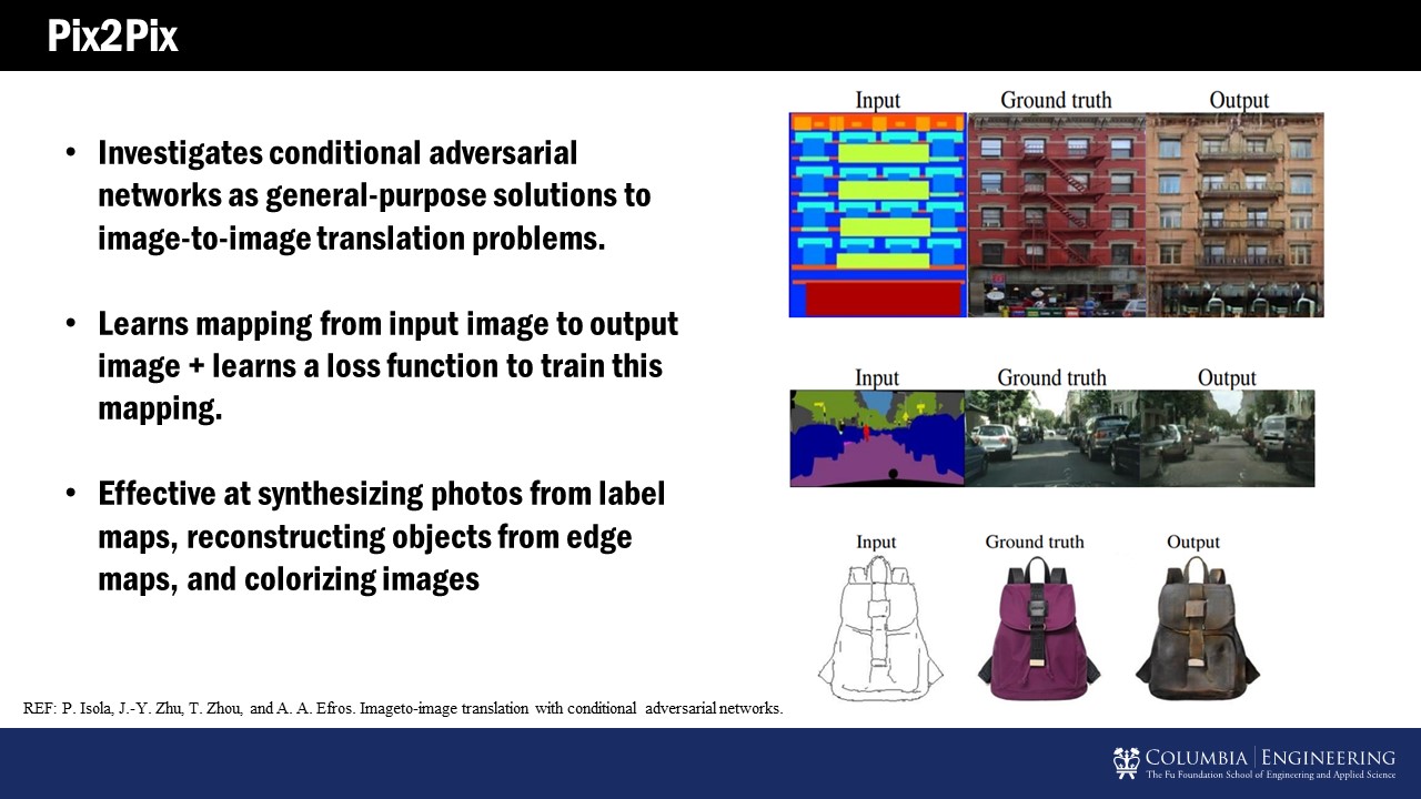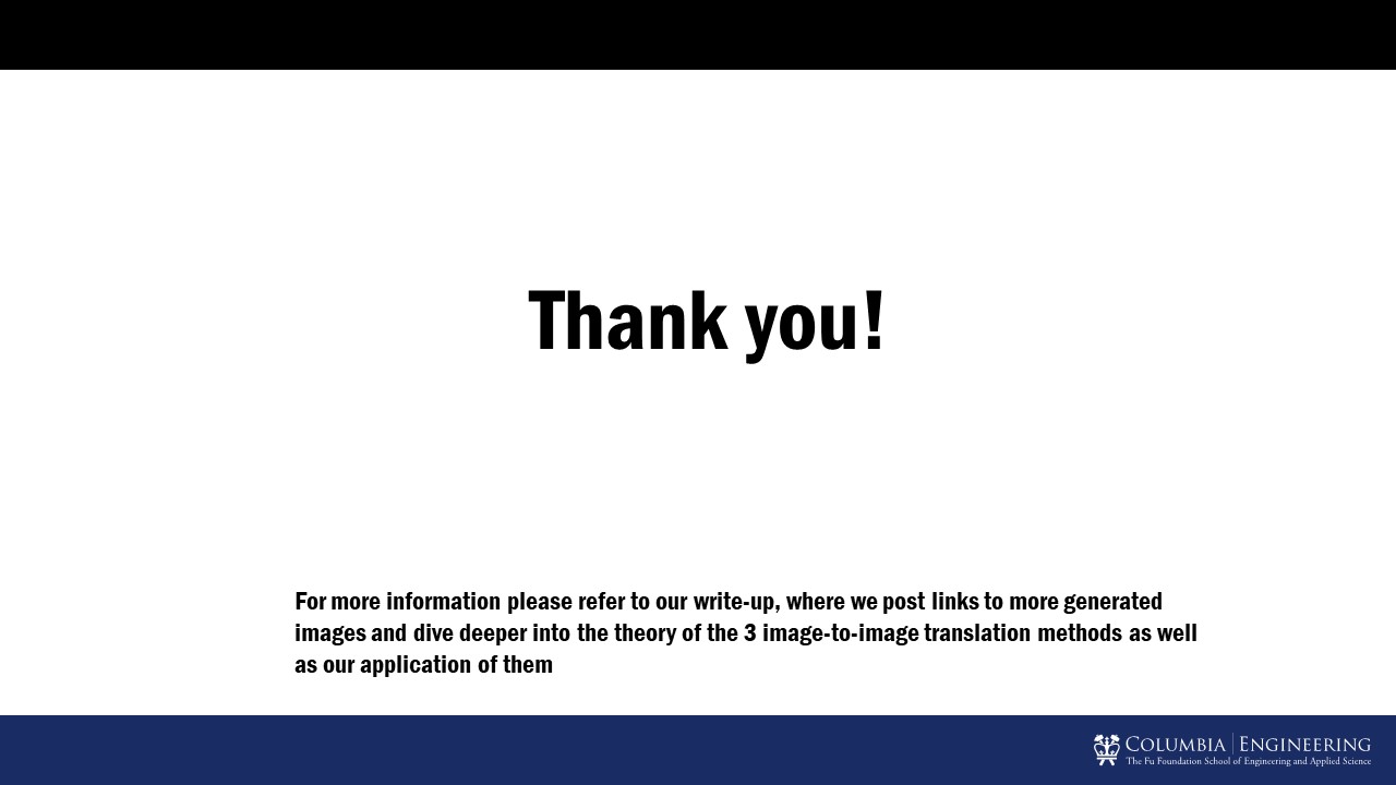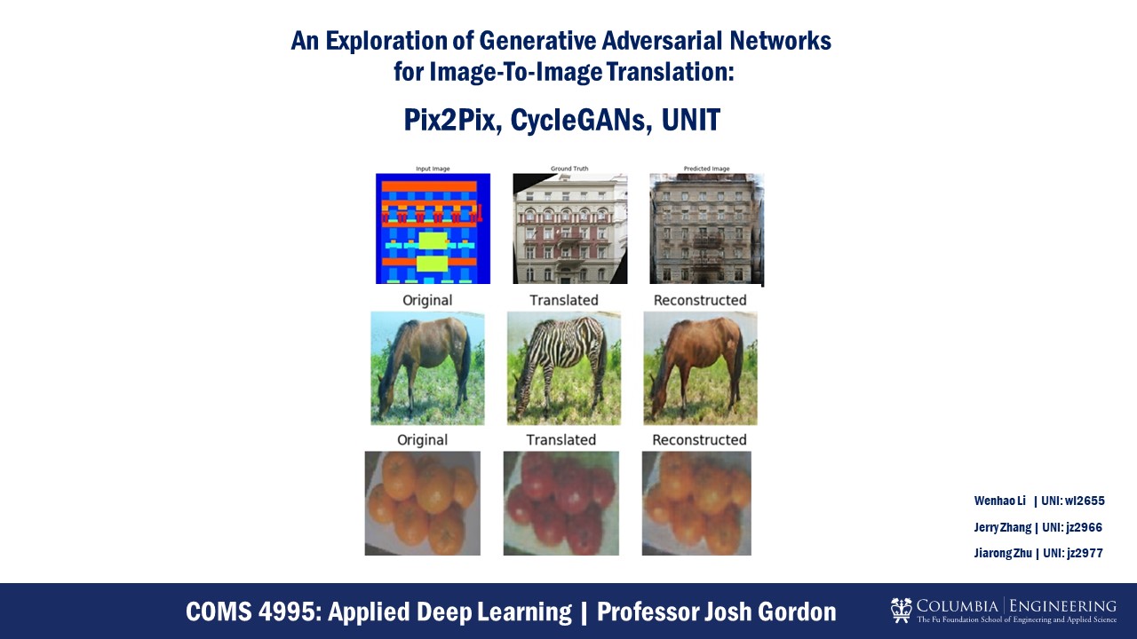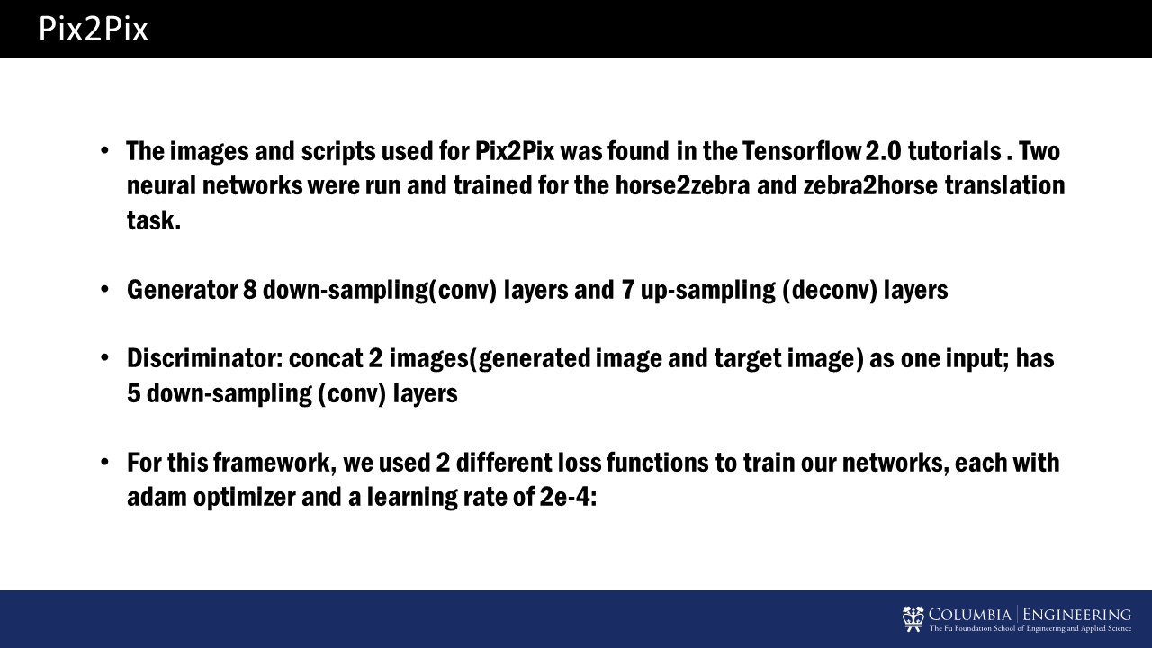 For my applied deep learning class at Columbia, my team members and I explored various image-to-image translation methods involving generative adversarial networks. Please see the below slides to learn more about our project!
