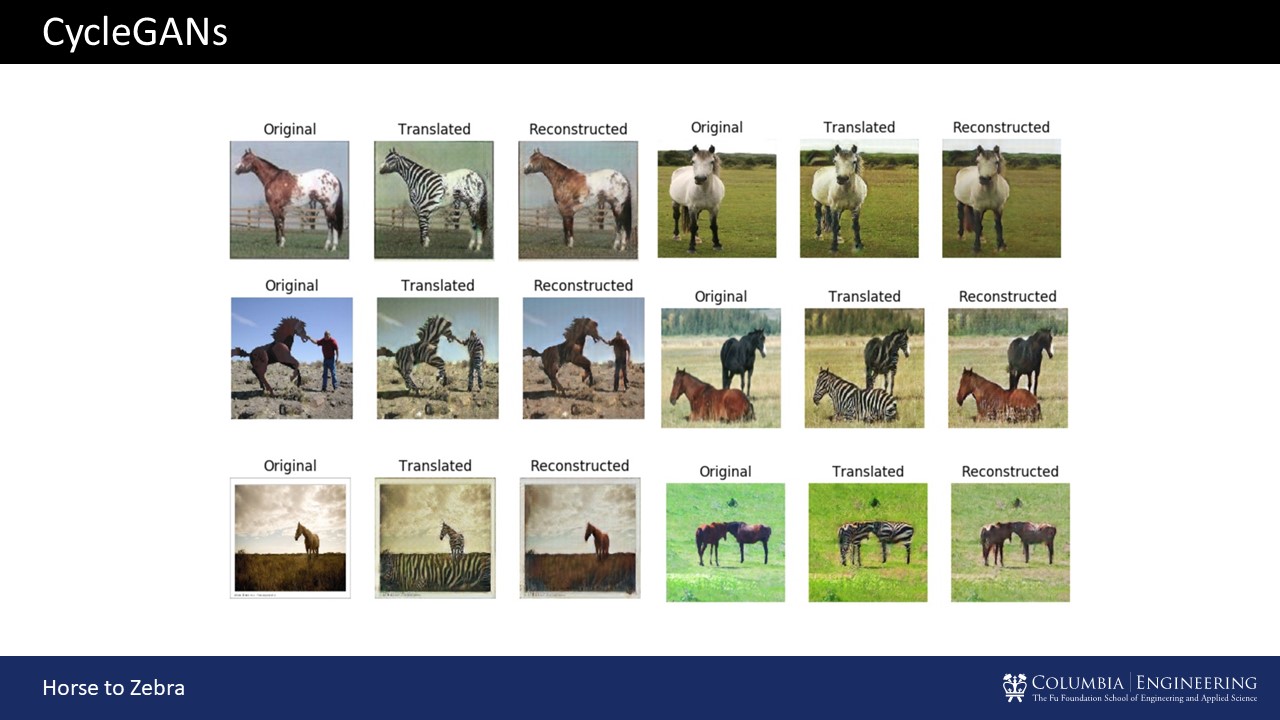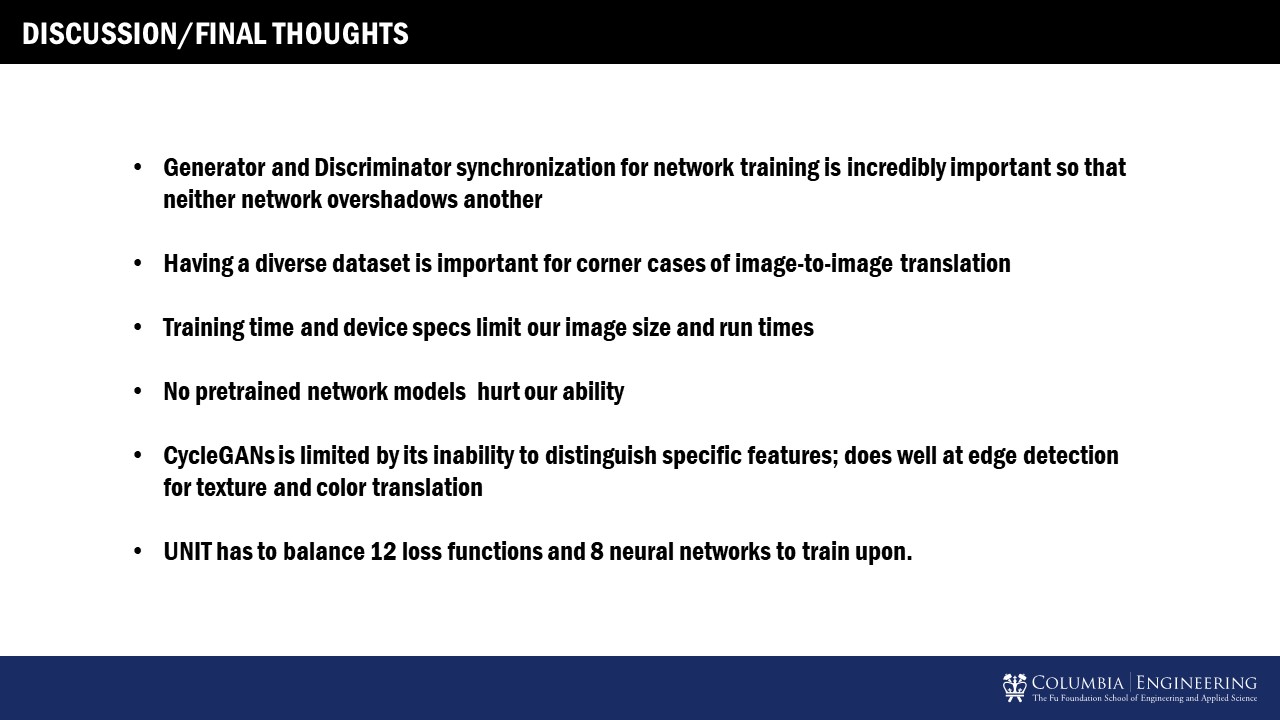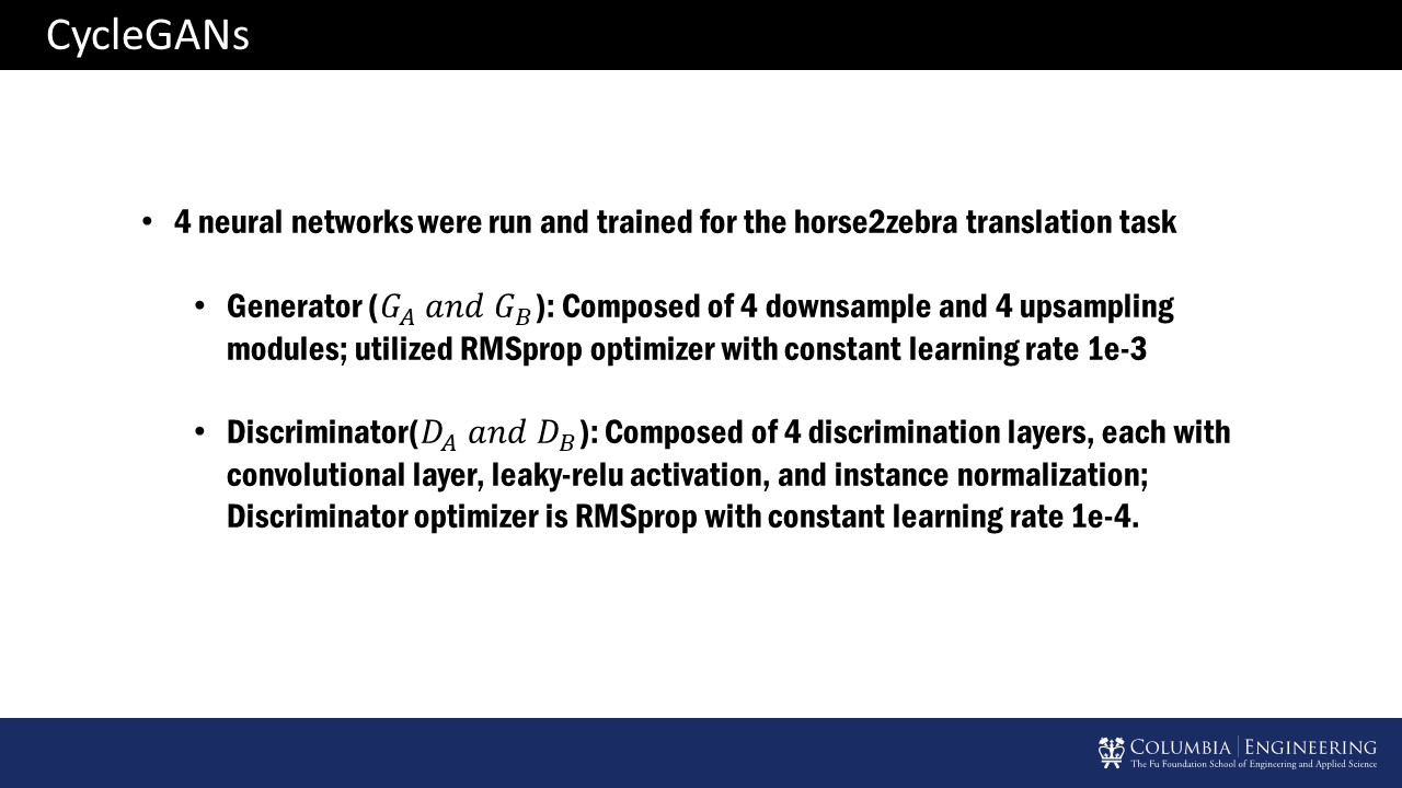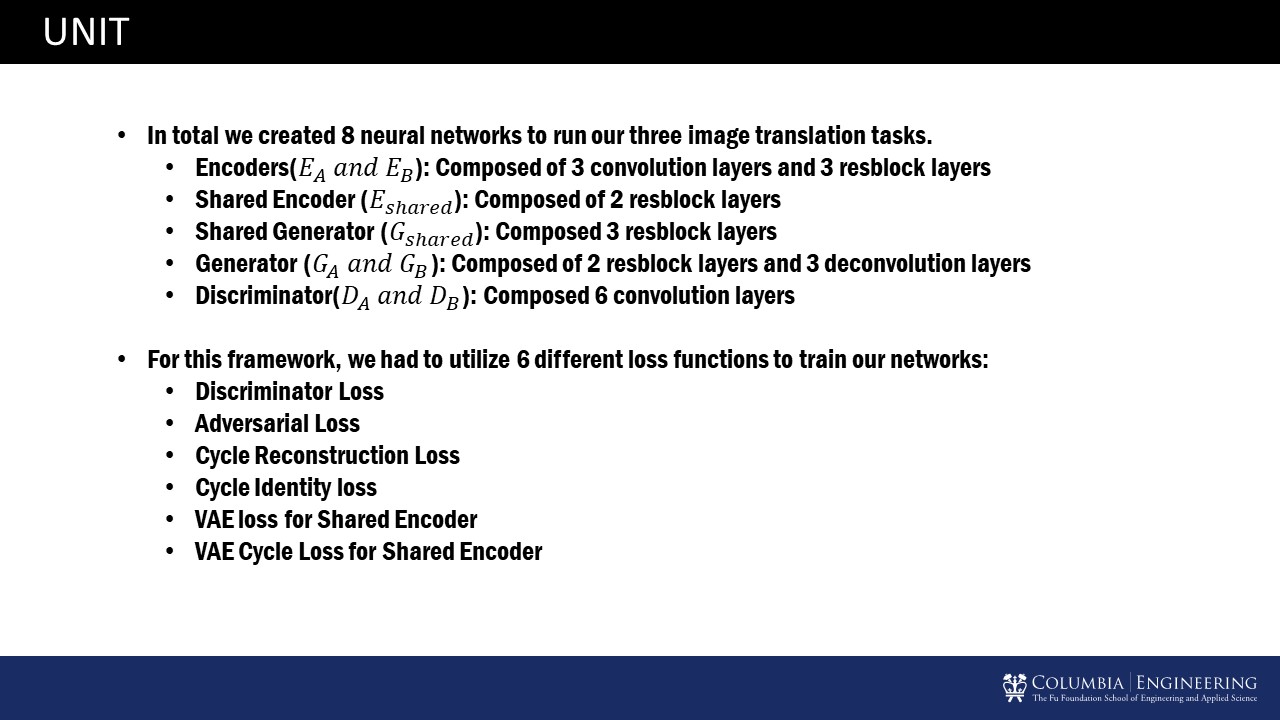 For my applied deep learning class at Columbia, my team members and I explored various image-to-image translation methods involving generative adversarial networks. Please see the below slides to learn more about our project!