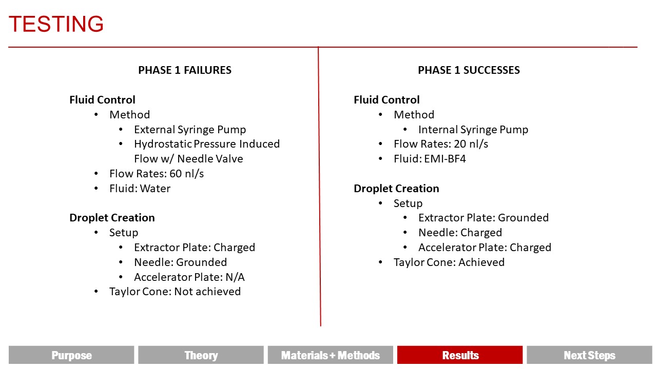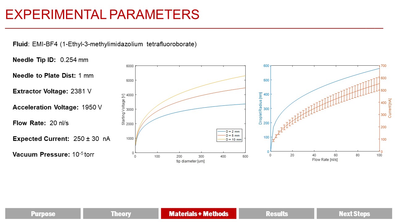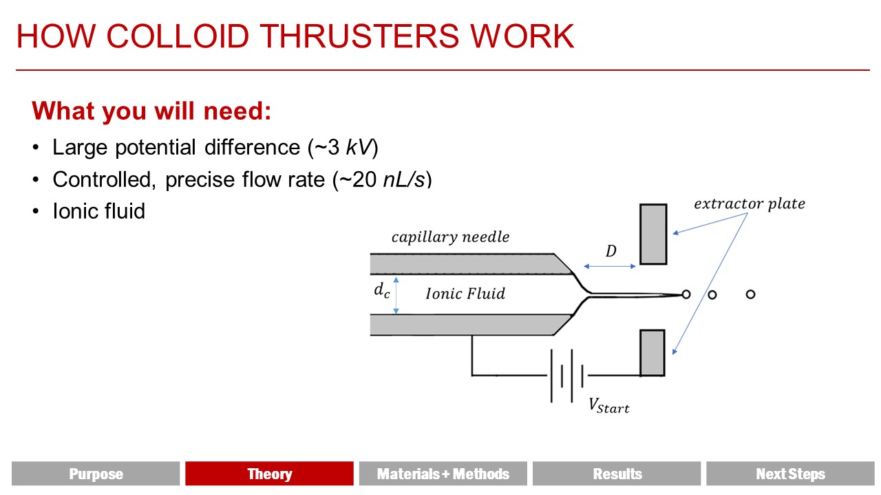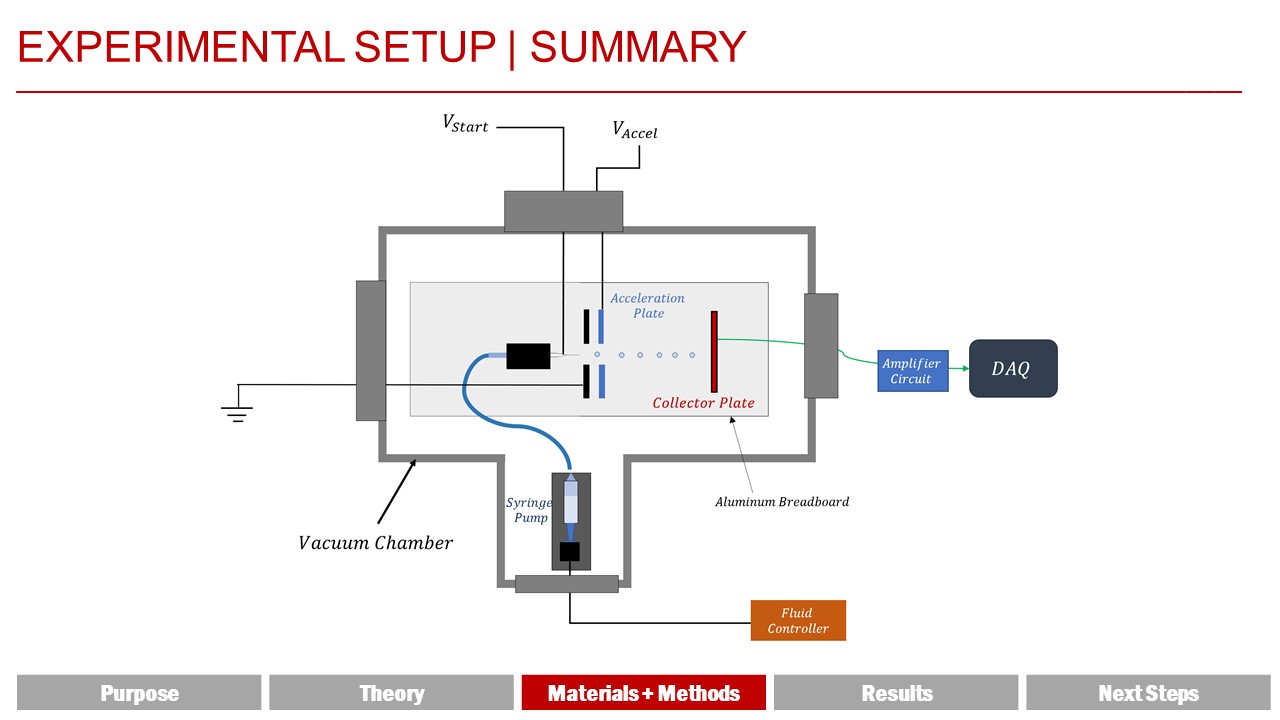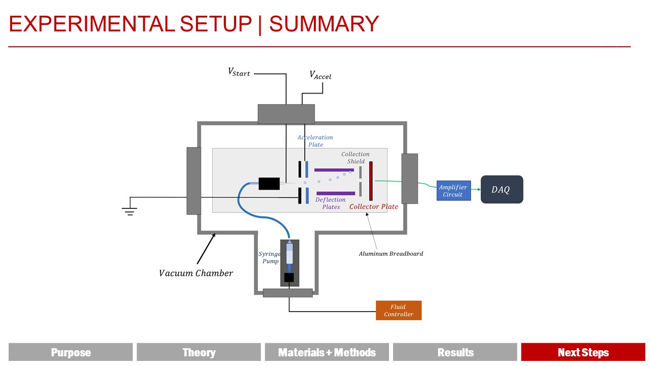 For my senior project at USC, my friend and I created an electrospray thruster + testbed w/ high voltage power supplies, ionic fluid, precision syringe pump, rapid prototyped components. We assembled a vacuum chamber to operate at 10-5 torr w/ roughing pump, turbo pump, and ion gauge pressure sensors. Additionally, we had to create a transimpedance op-amp circuit + programm DAQ system to convert low current (~10 nA) ion droplets to readable voltages. After we were finished with our experimental system, we installed deflection plates to electrostatically deflect the ionic droplets as they disseminated out of our micropropulsion thruster.