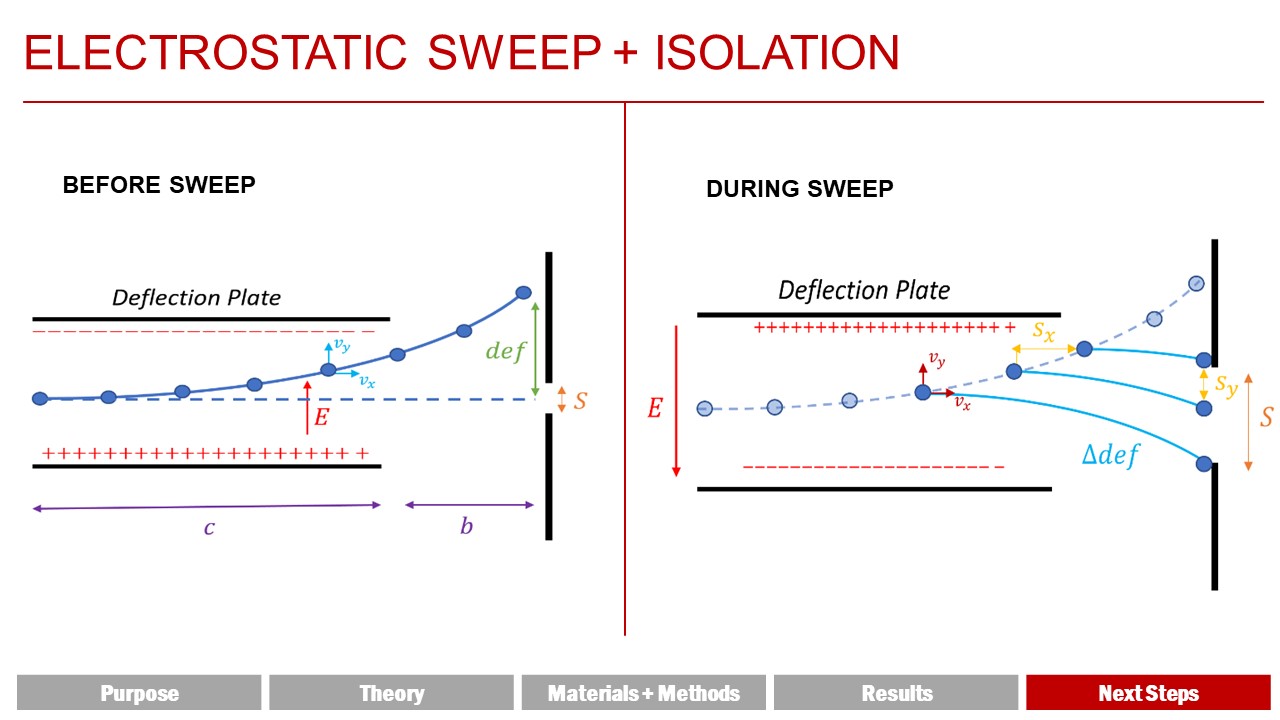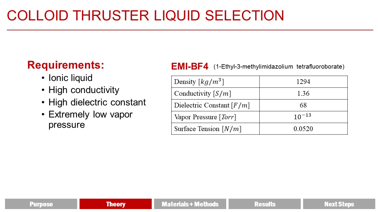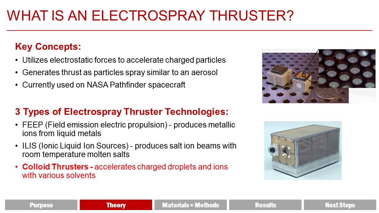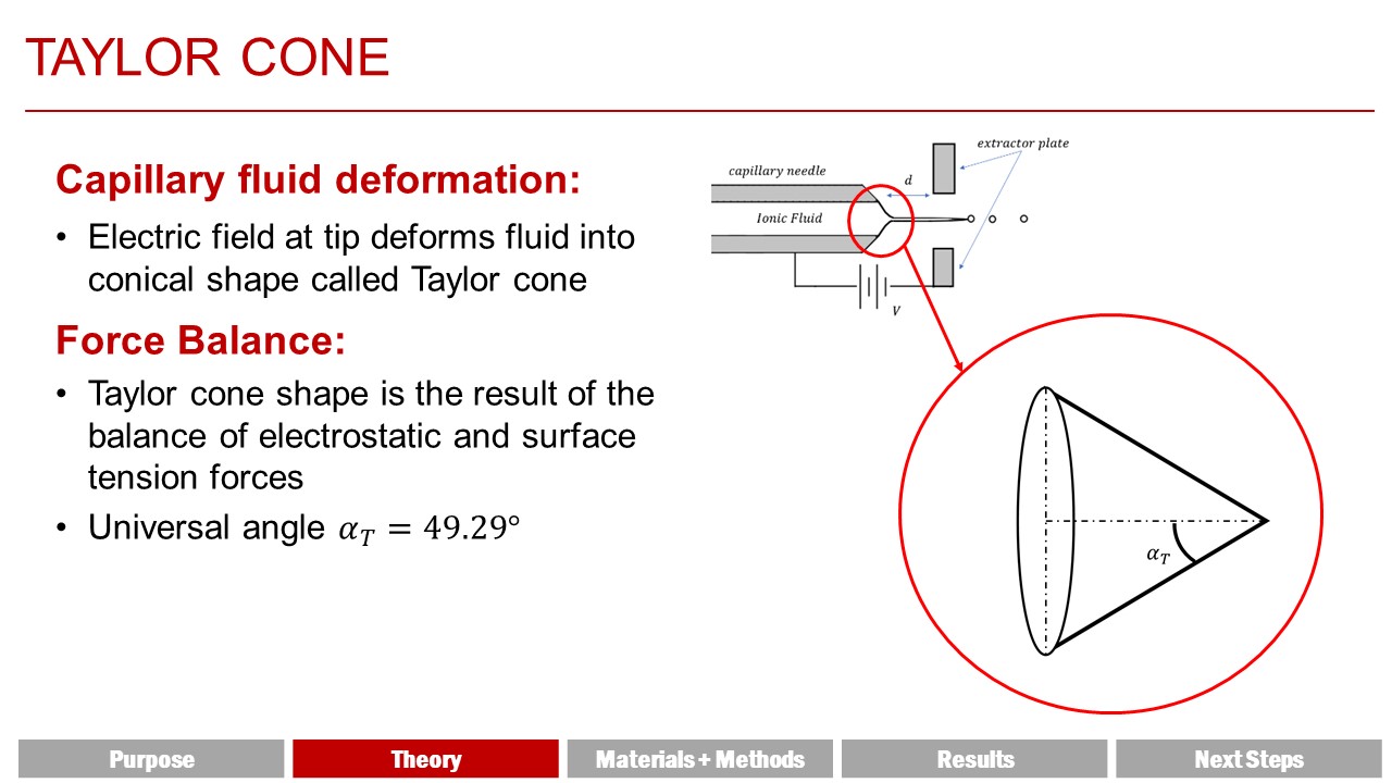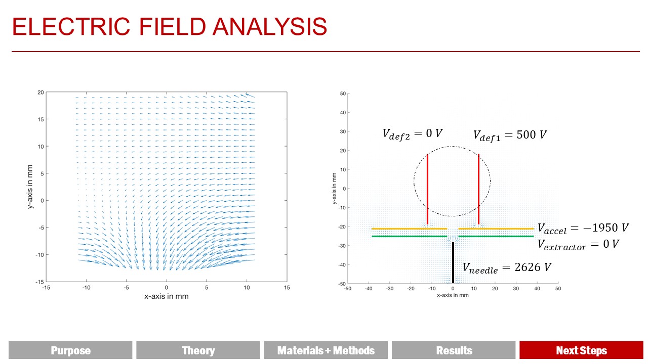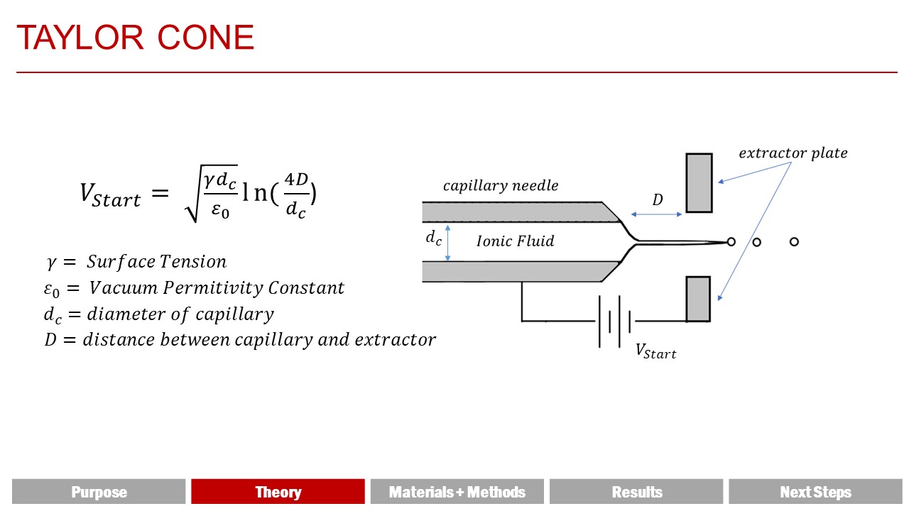 For my senior project at USC, my friend and I created an electrospray thruster + testbed w/ high voltage power supplies, ionic fluid, precision syringe pump, rapid prototyped components. We assembled a vacuum chamber to operate at 10-5 torr w/ roughing pump, turbo pump, and ion gauge pressure sensors. Additionally, we had to create a transimpedance op-amp circuit + programm DAQ system to convert low current (~10 nA) ion droplets to readable voltages. After we were finished with our experimental system, we installed deflection plates to electrostatically deflect the ionic droplets as they disseminated out of our micropropulsion thruster.